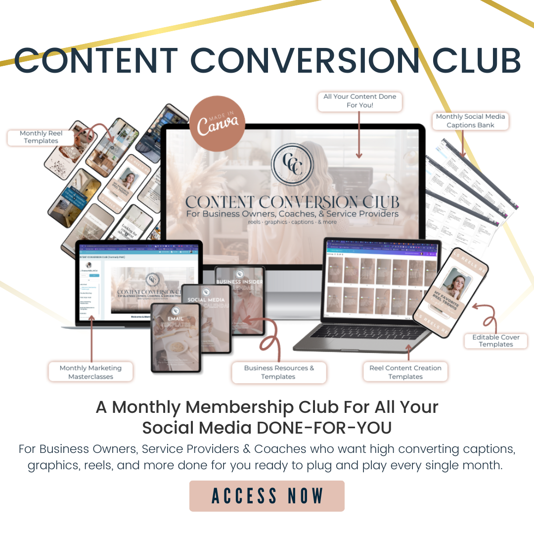 A monthly membership club for service based business owners! Get done-for-you plug-and-play captions, graphics, emails, and so much more that turn your social media into a money-making machine! ONLY $27/M